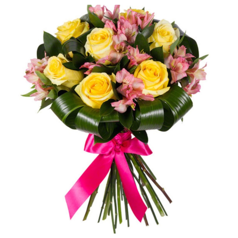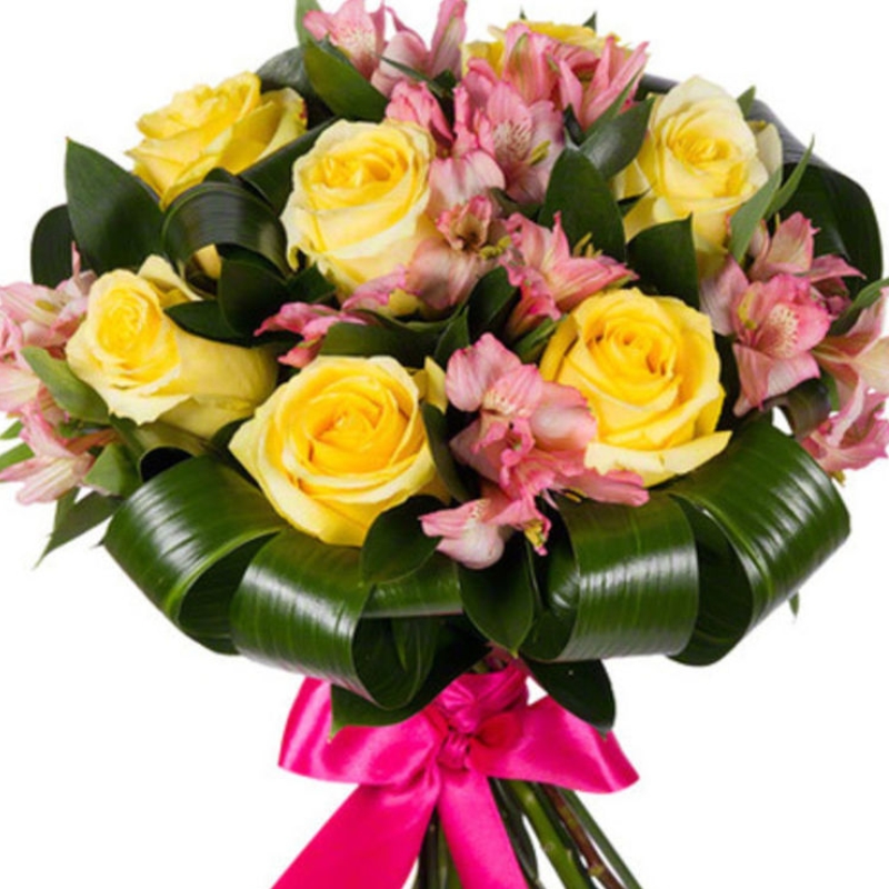 Букет из желтых роз и розовой альстромерии