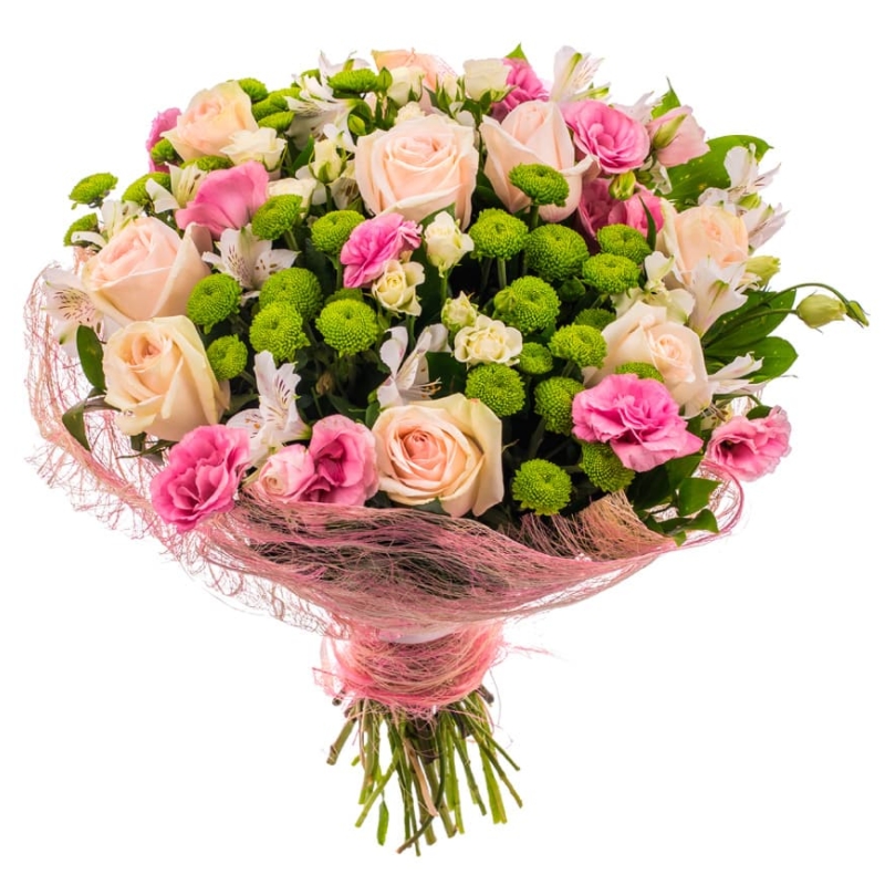Букет состоит из 11 кремовых роз, 5 кустовых роз, 7 веток эустомы, 7 альстромерий, 7 кустовых хризантем, красивая упаковка, атласная лента.