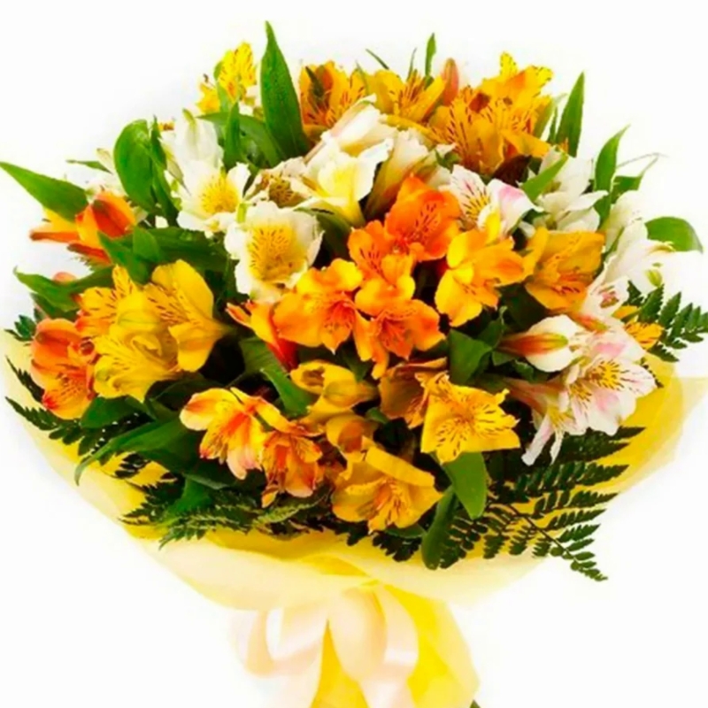 Букет состоит из 11 веток альстромерий, папоротник, салал, красивая упаковка, атласная лента.