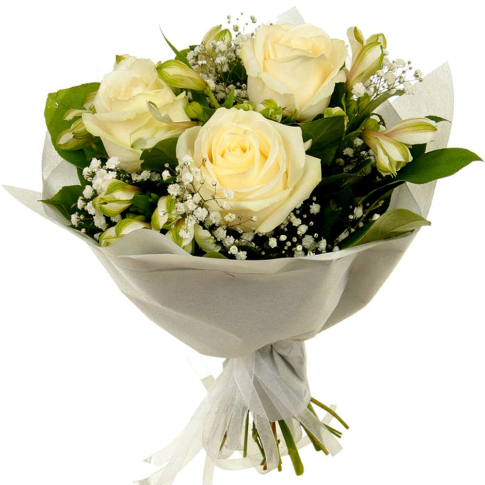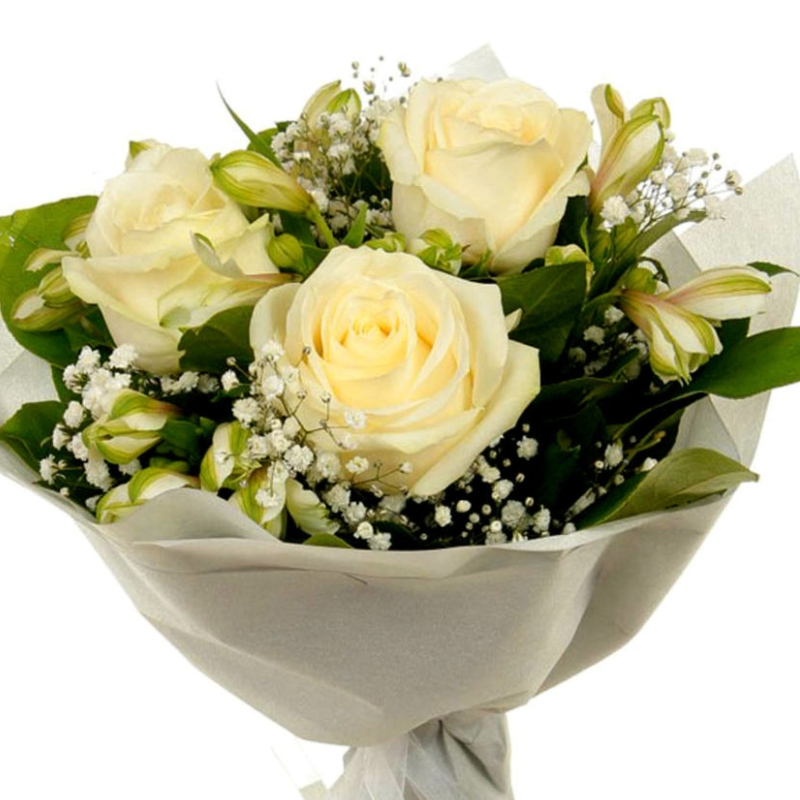 Букет состоит из 3 кремовые розы, 2 ветки белой альстромерии, 2 ветки гипсофилы, красивая упаковка, атласная лента.