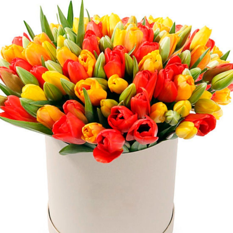 Букет состоит из 51 красный тюльпан, 50 желтых тюльпанов, коробка, оазис.