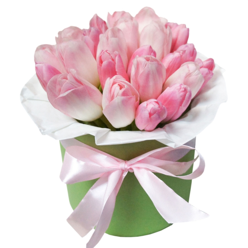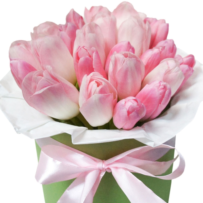 Букет состоит из 21 розовый тюльпан, коробка, атласная лента, оазис.