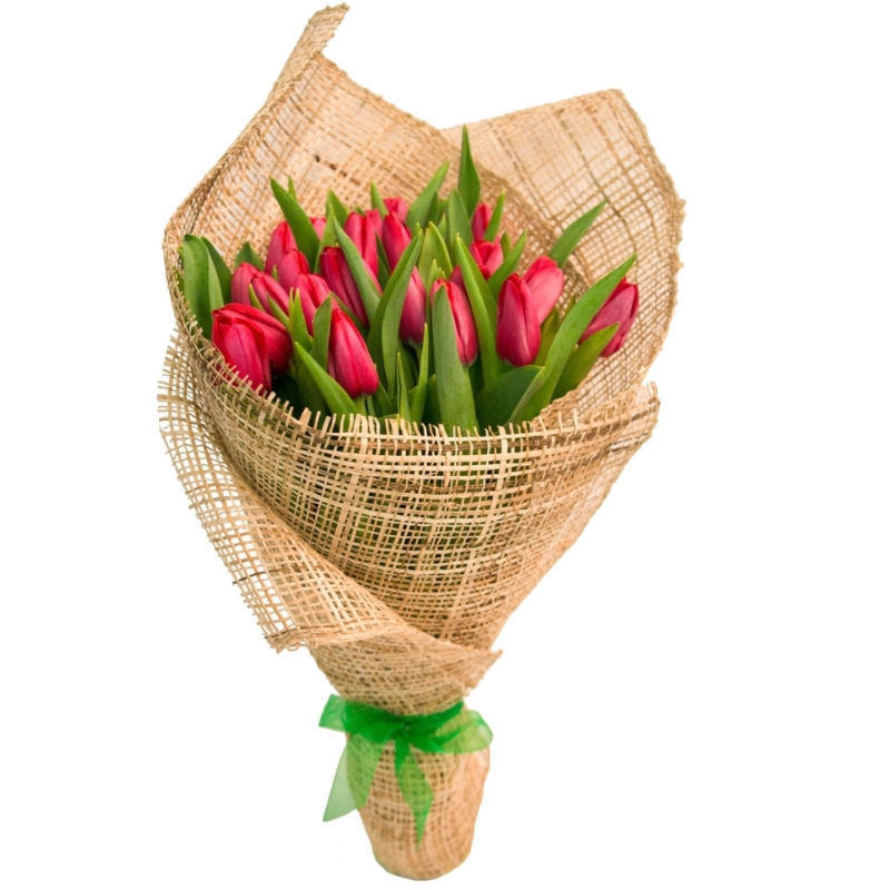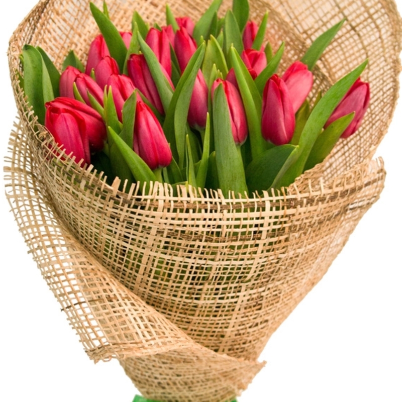Букет состоит из 21 красный тюльпан, красивая упаковка, атласная лента.