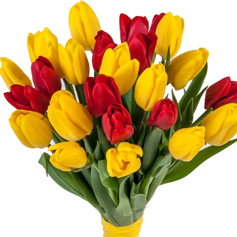 Букет состоит из 11 желтых тюльпанов, 10 красных тюльпанов, прозрачная упаковка, атласная лента.