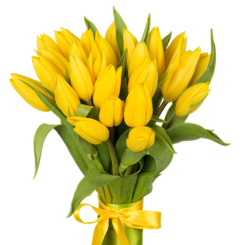 Букет состоит из 21 желтый тюльпан, прозрачная упаковка, атласная лента.