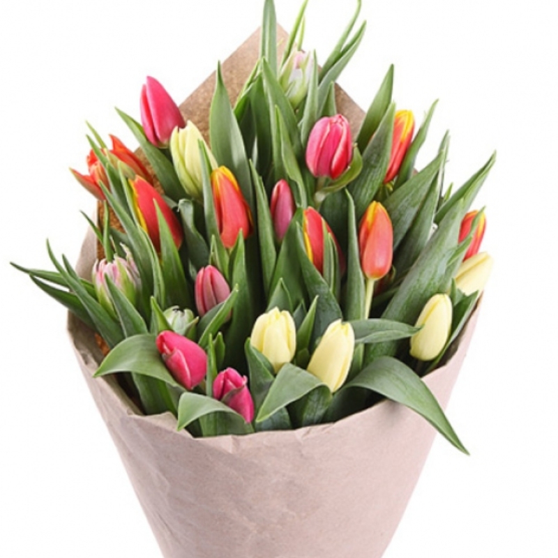 Букет состоит из 11 красных тюльпанов, 10 желтых тюльпанов, крафт, атласная лента.