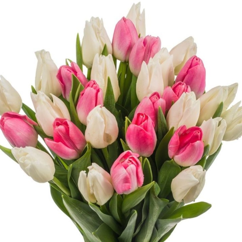 Букет состоит из 11 розовых тюльпанов, 10 белых тюльпанов, лента.
