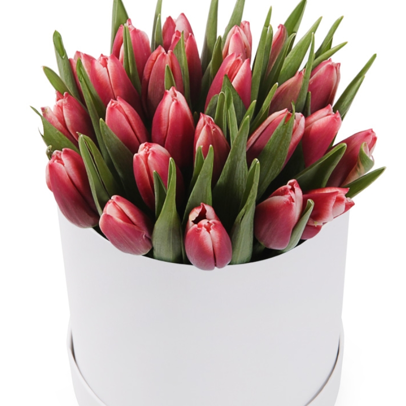 Букет состоит из 25 красных тюльпанов, коробка, оазис.