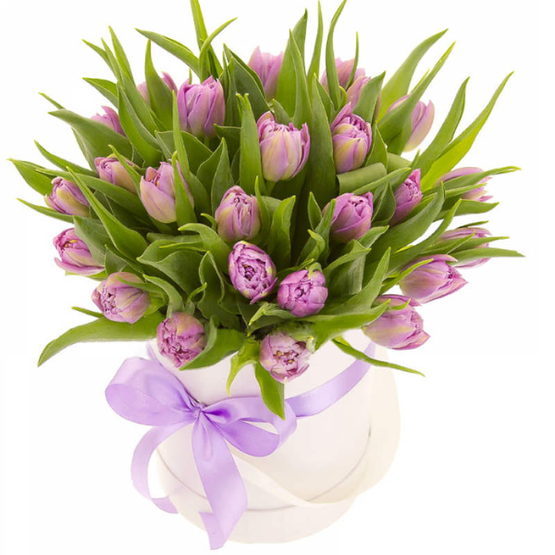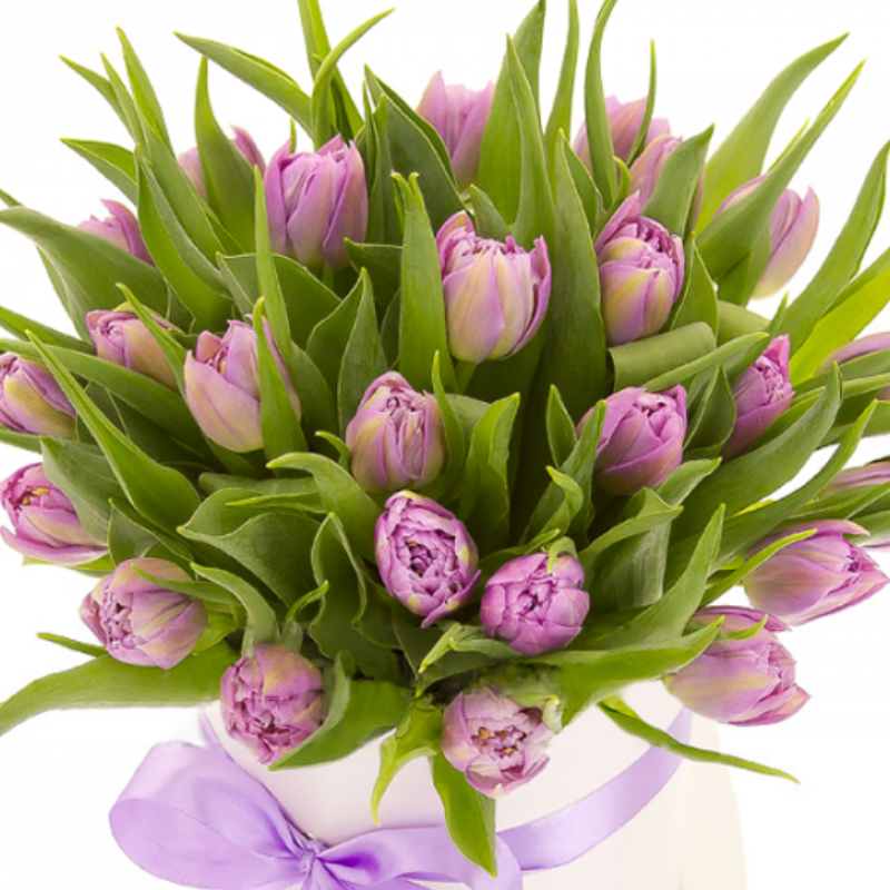 Букет состоит из 25 сиреневых тюльпанов, коробка, атласная лента, оазис.