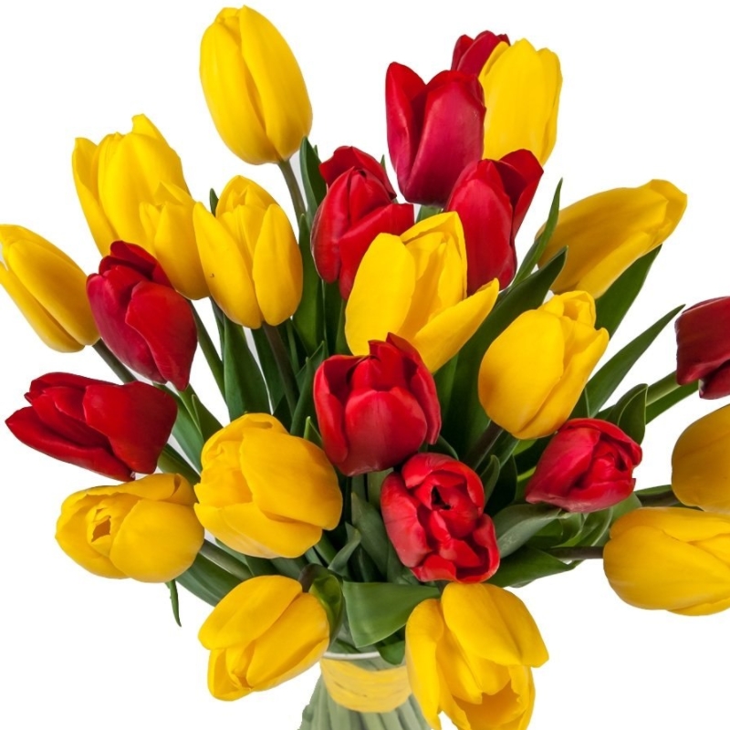 Букет состоит из 13 желтых тюльпанов, 12 красных тюльпанов, прозрачная упаковка.
