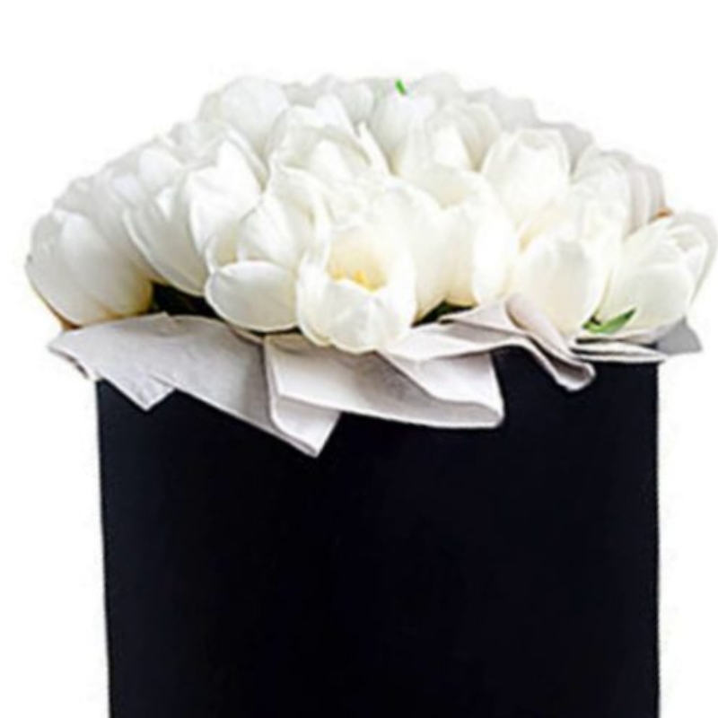 Букет состоит из 35 белых тюльпанов, коробка, оазис.