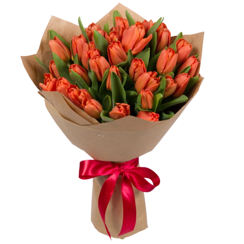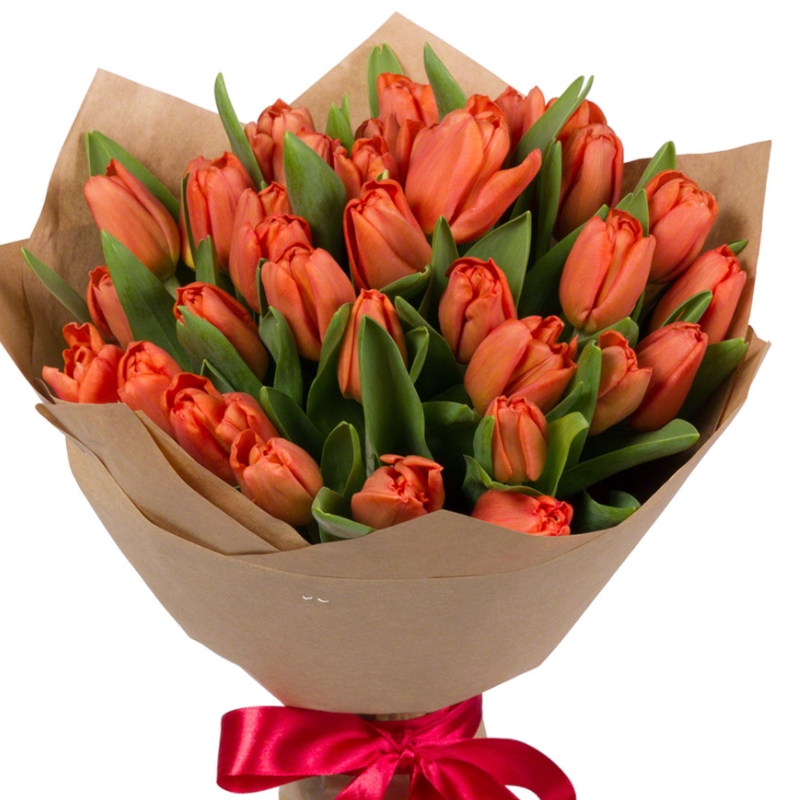 Букет состоит из 35 красных тюльпанов, крафт, атласная лента.