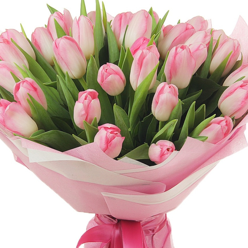 Букет состоит из 35 розовых тюльпанов, красивая упаковка, атласная лента.