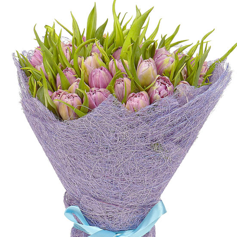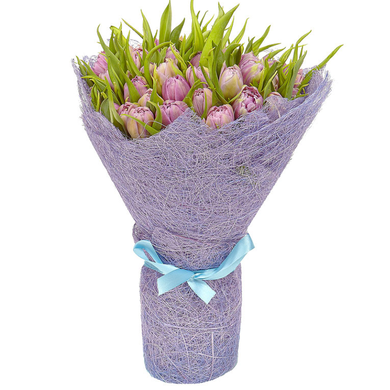 Букет состоит из 51 сиреневый тюльпан, красивая упаковка, атласная лента.