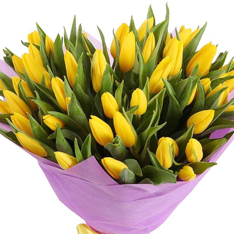 Букет состоит из 51 желтый тюльпан, красивая упаковка, атласная лента.