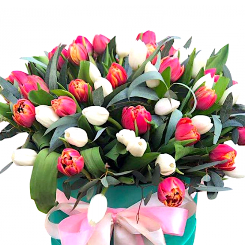 Букет состоит из 26 красных тюльпанов, 25 розовых тюльпанов, зелень, атласная лента, коробка, оазис.
