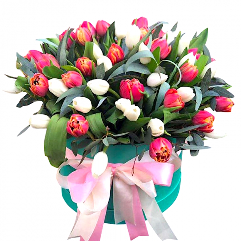 Букет из тюльпанов и зелени в коробке