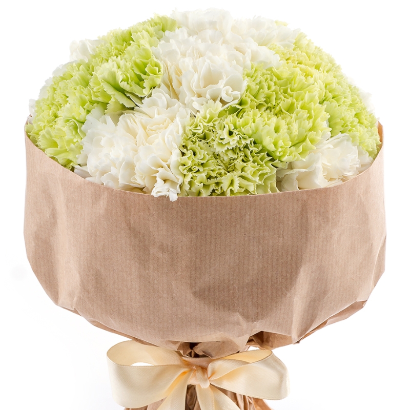 Букет состоит из 8 белых гвоздик, 7 зеленых гвоздик, крафт, атласная лента.