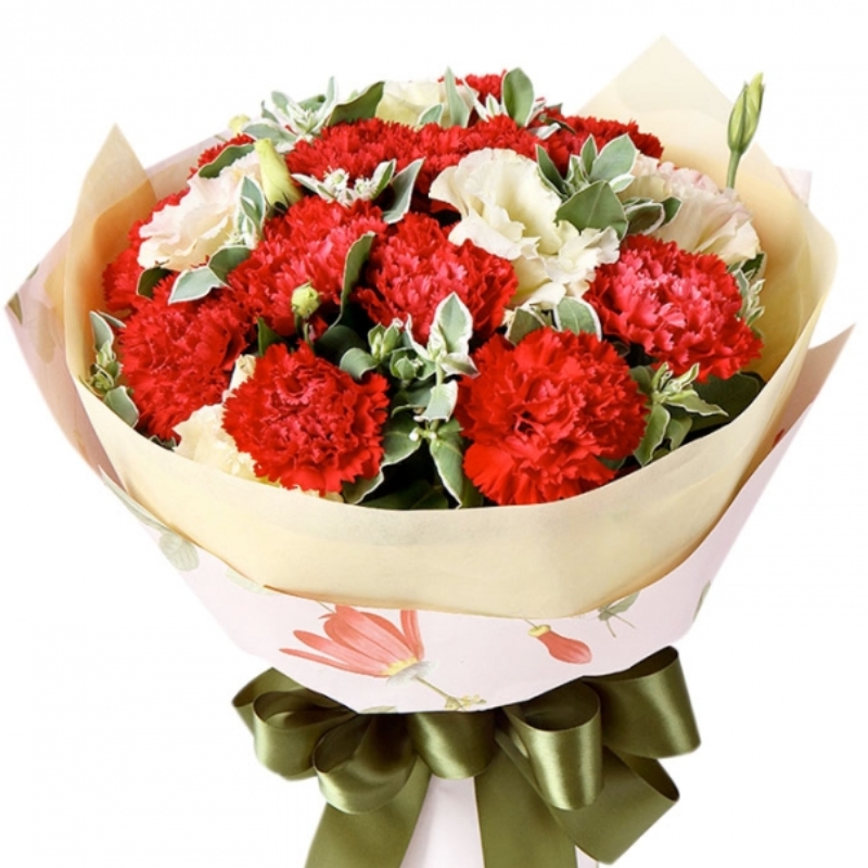 Букет состоит из 13 красных гвоздик, 5 белых эустом, зелень, красивая упаковка, атласная лента.