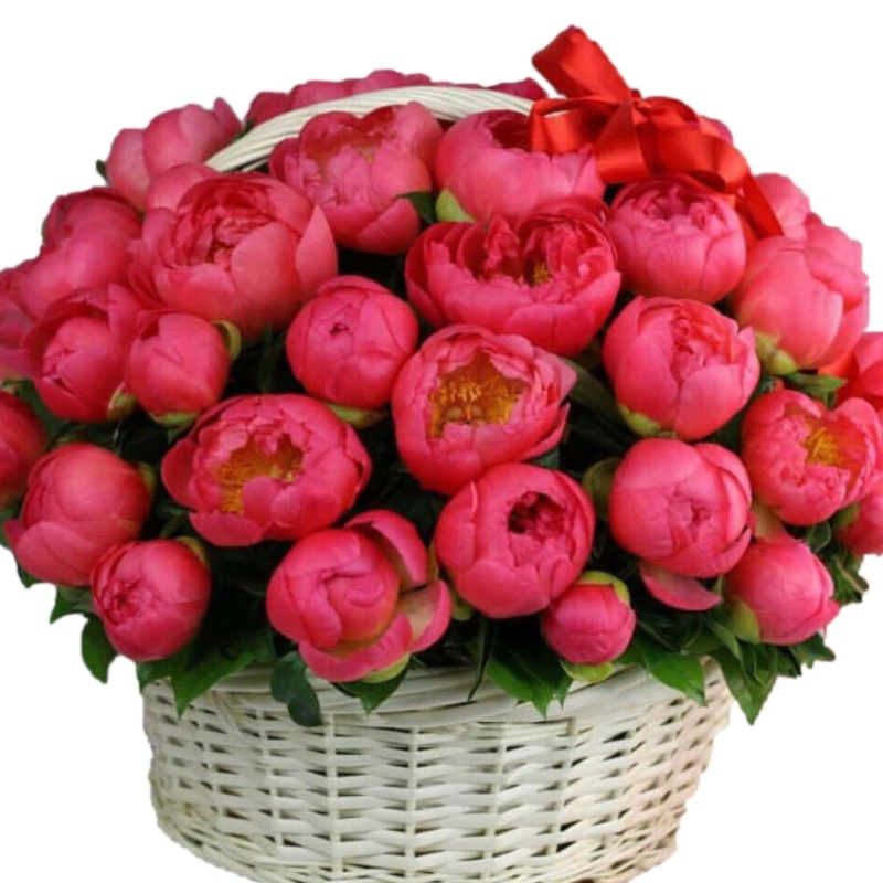 Букет состоит из 51 красный пион, зелень, корзина, оазис.