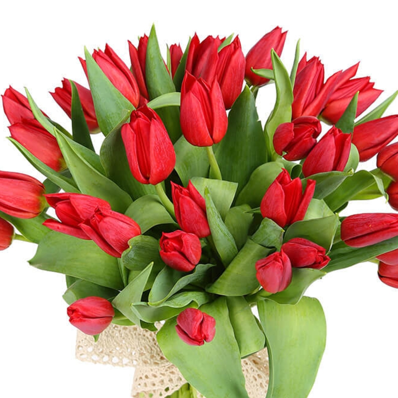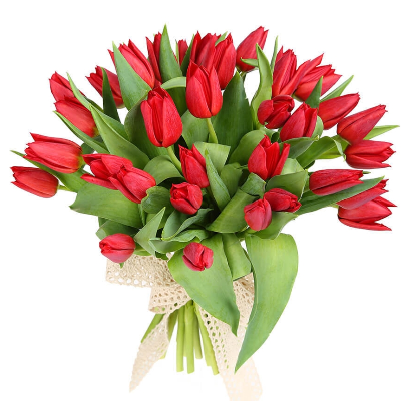 Букет состоит из 31 красный тюльпан, прозрачная упаковка, атласная лента.