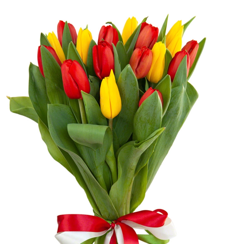 Букет состоит из 10 красных тюльпанов, 7 желтых тюльпанов, прозрачная упаковка, атласная лента.