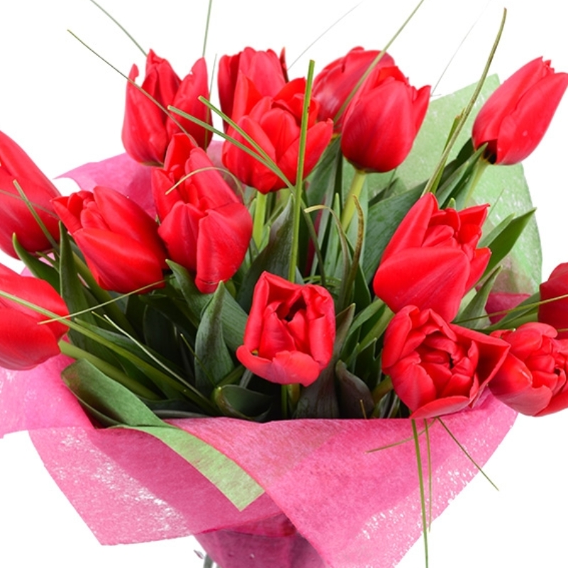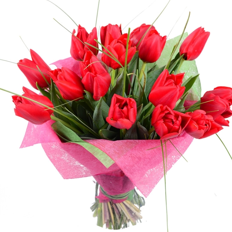 Букет состоит из 15 красных тюльпанов, зелень, красивая упаковка, атласная лента.