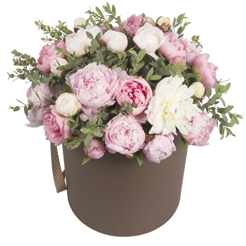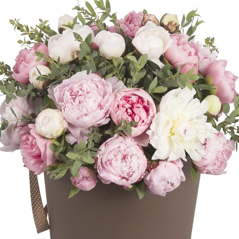 Буке из белых и розовых пионов в коробке