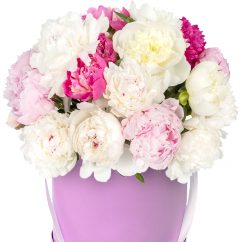 Букет состоит из MIX из 21 белого / красного / розового пиона, коробка.