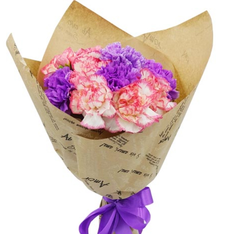 Букет состоит из 5 розовых гвоздик, 4 сиреневые гвоздики, крафт, атласная лента.
