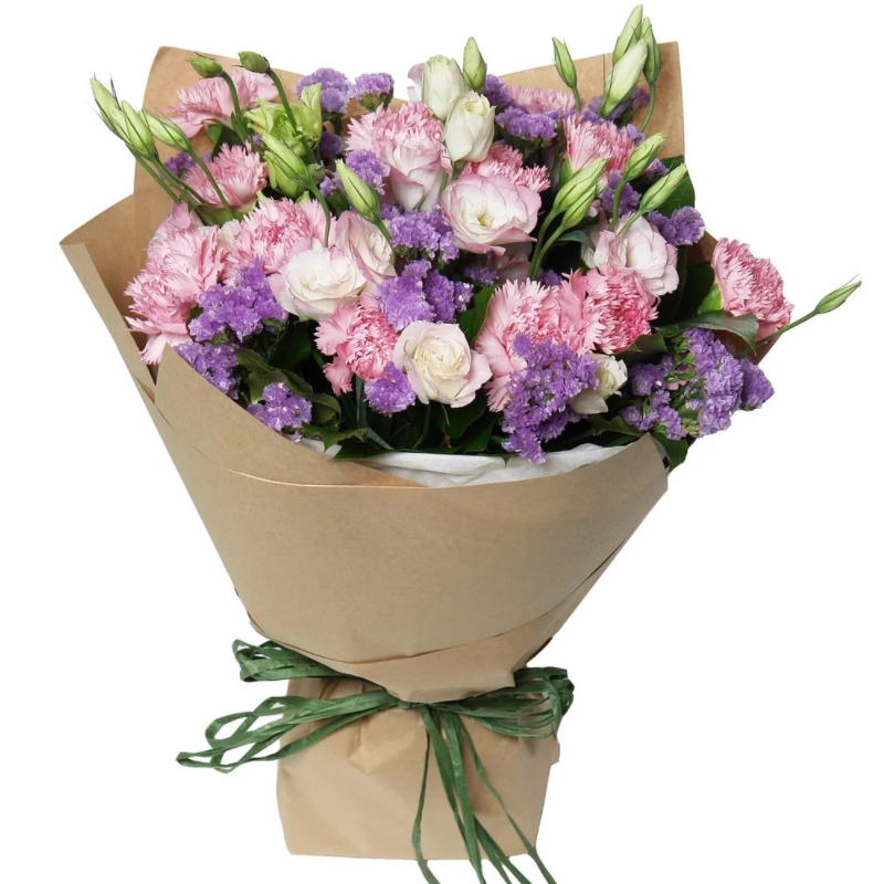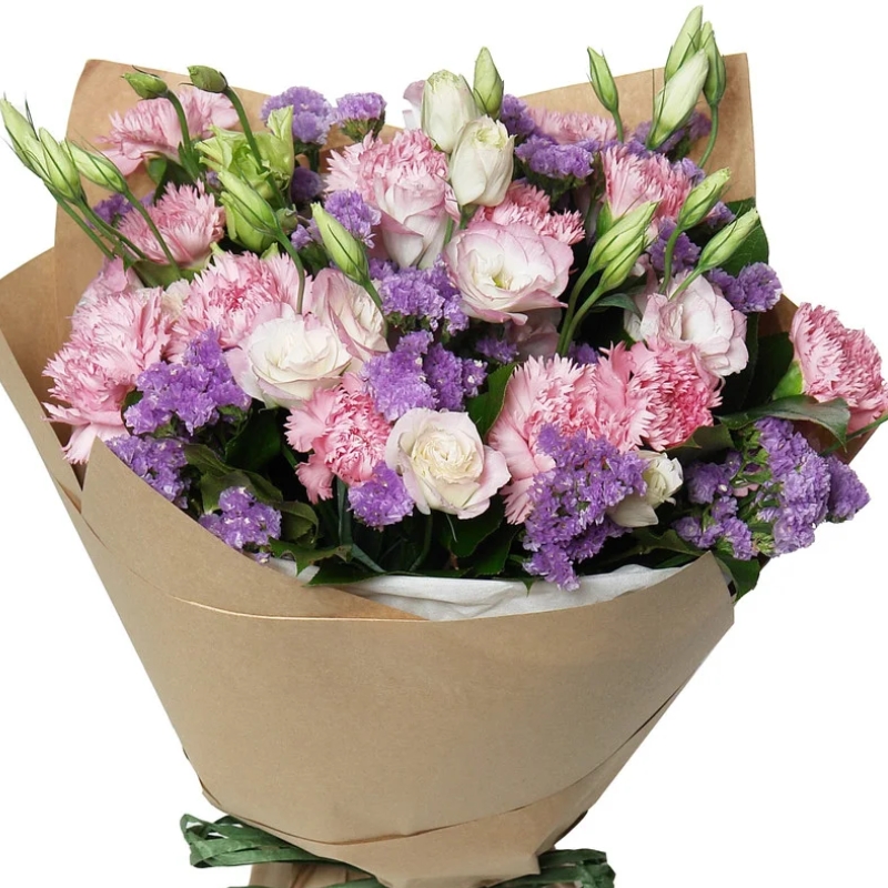 Букет состоит из 11 гвоздик, 5 эустом, 5 веток статицы, крафт, атласная лента.