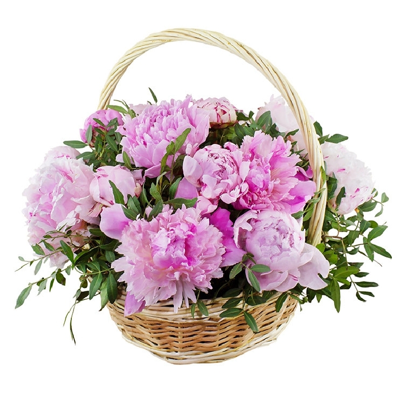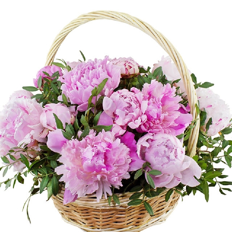 Букет состоит из 15 пионов, зелень, корзина, оазис.