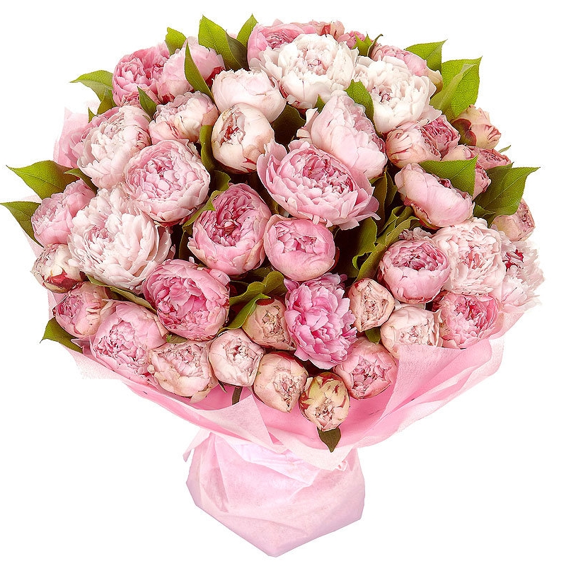 Букет состоит из 45 розовых пионов, зелень, красивая упаковка, атласная лента.