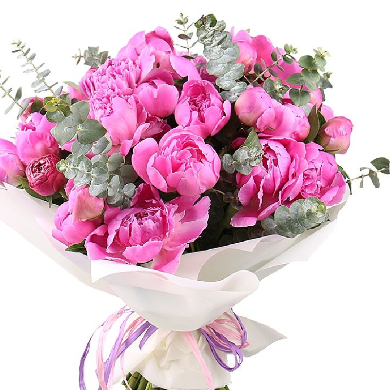 Букет состоит из 25 пионов, эвкалипт, красивая упаковка, атласная лента.