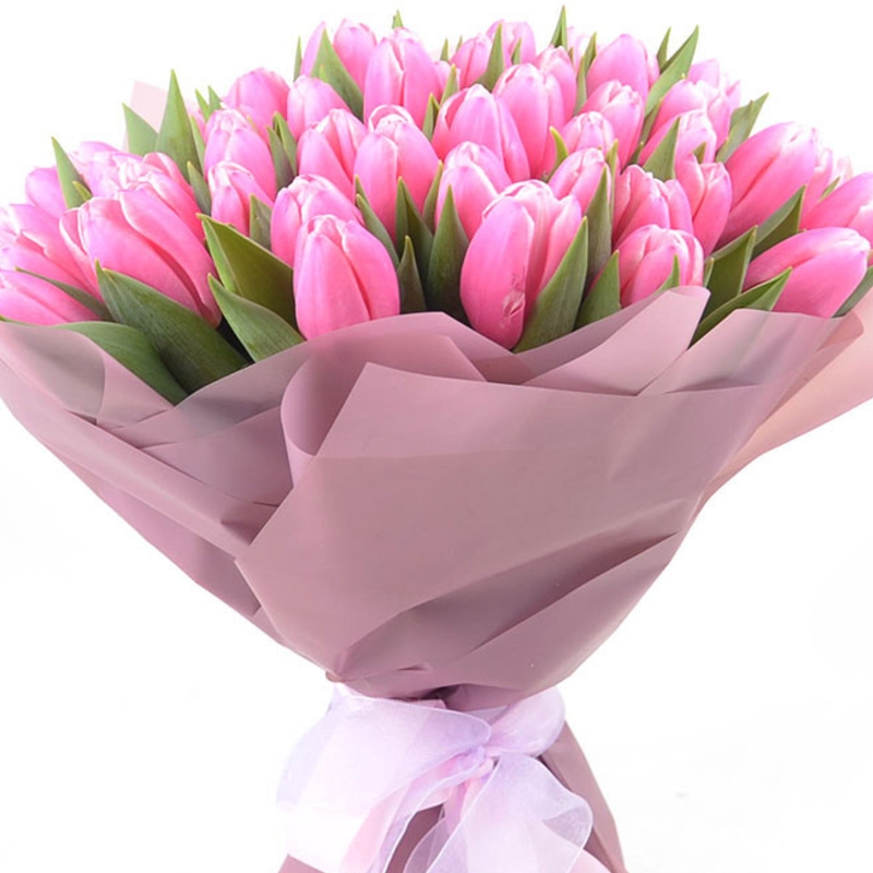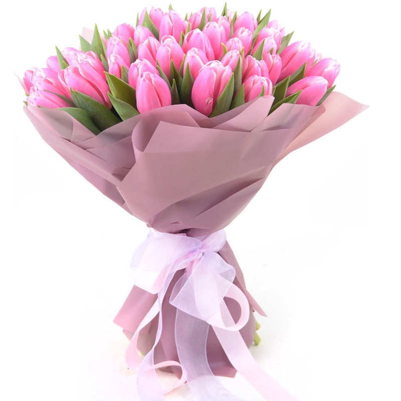 Букет состоит из 51 розовый тюльпан, красивая упаковка, атласная лента.