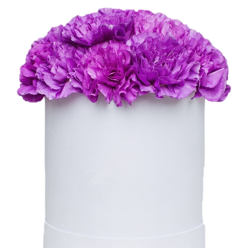 Букет состоит из 21 сиреневая гвоздика, коробка, оазис.