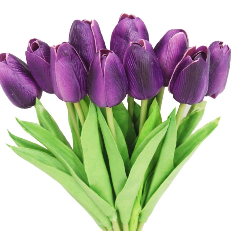 Букет состоит из 9 сиреневых тюльпанов, прозрачная упаковка, атласная лента.