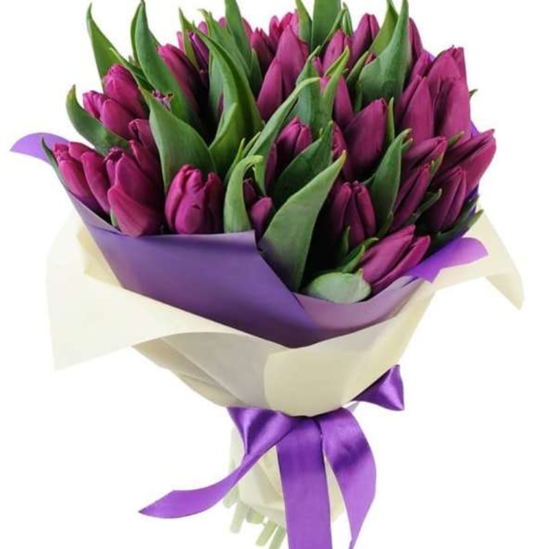 Букет состоит из 29 сиреневых тюльпанов, красивая упаковка, атласная лента.