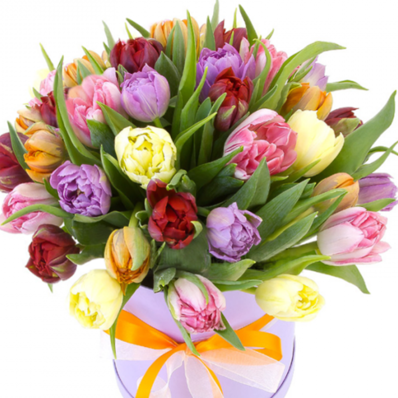 Букет состоит из MIX из 39 тюльпанов, коробка, атласная лента, оазис.