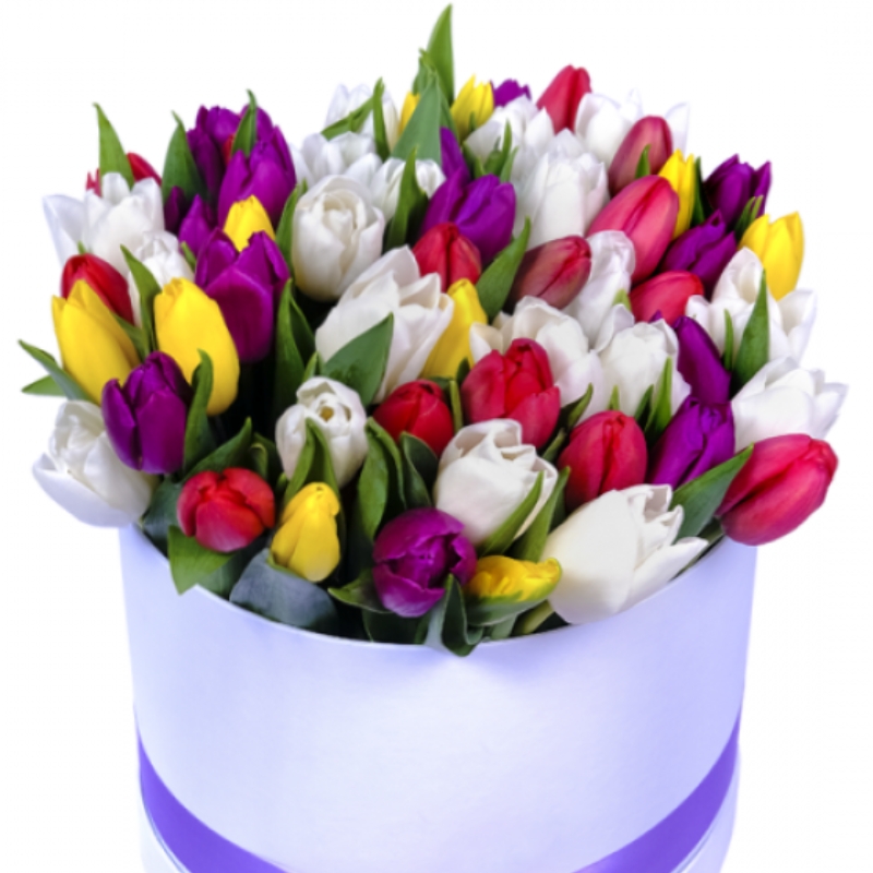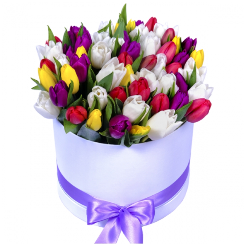 Букет состоит из MIX из 51 тюльпана, коробка, атласная лента, оазис.