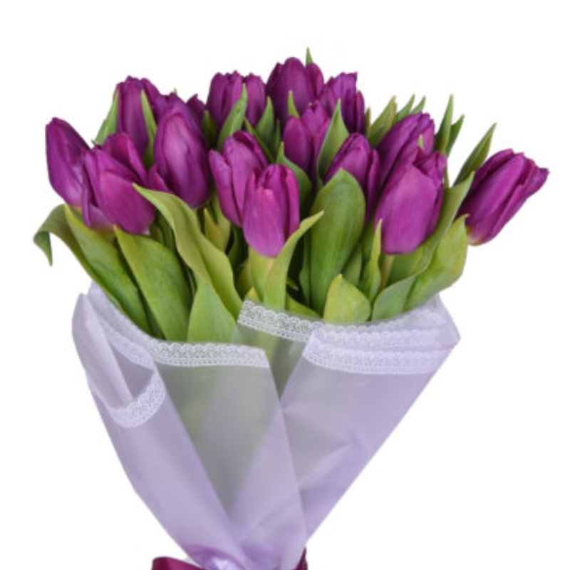 Букет состоит из 15 сиреневых тюльпанов, красивая упаковка, атласная лента.