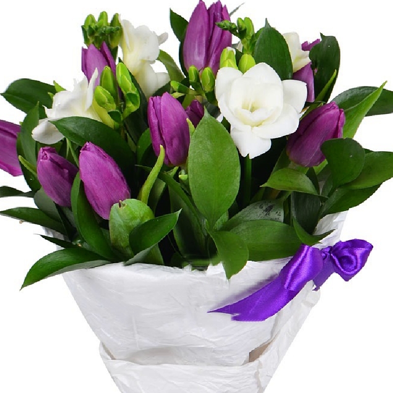 Букет состоит из 9 сиреневых тюльпанов, 4 белые фрезии, зелень, крафт, атласная лента.