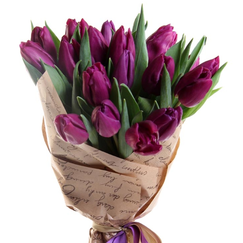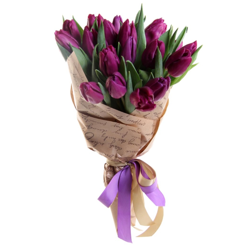 Букет состоит из 15 сиреневых тюльпанов, крафт, атласная лента.