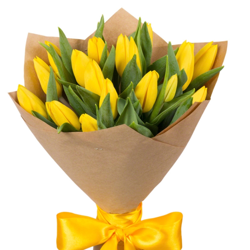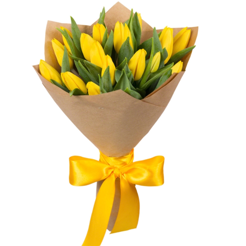 Букет состоит из 15 желтых тюльпанов, крафт, атласная лента.