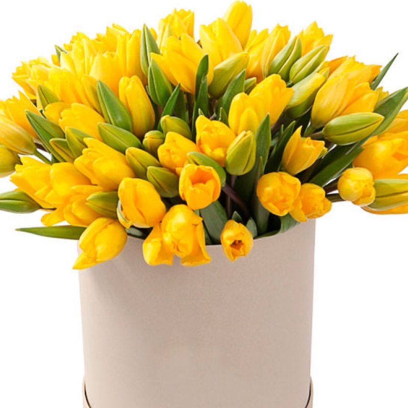 Букет состоит из 75 желтых тюльпанов, коробка, оазис.