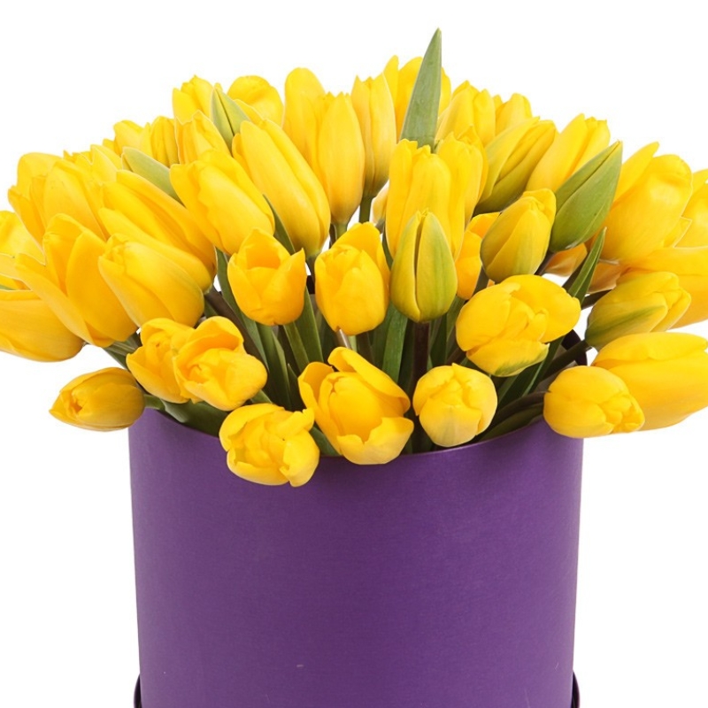 Букет состоит из 45 желтых тюльпанов, коробка, оазис.