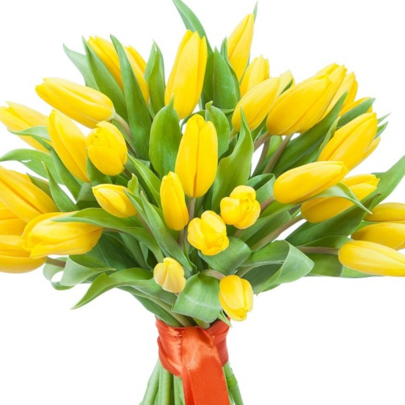 Букет состоит из 31 желтый тюльпан, прозрачная упаковка, атласная лента.
