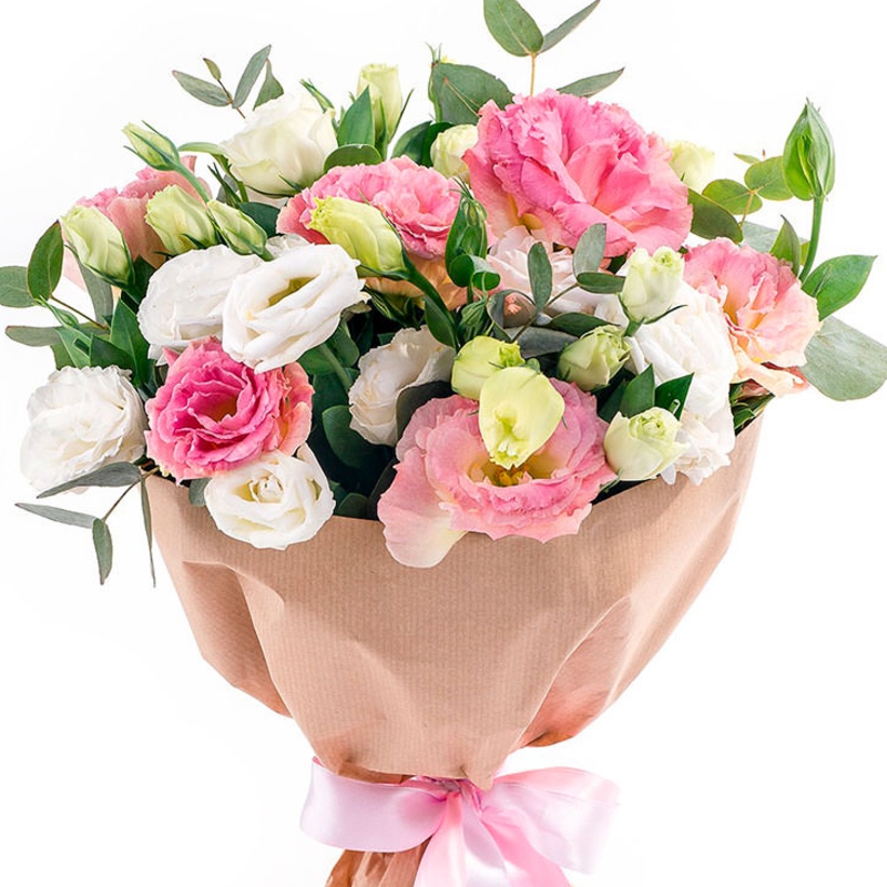 Букет состоит из 15 веток белой и розовой эустомы, зелень, крафт, атласная лента.