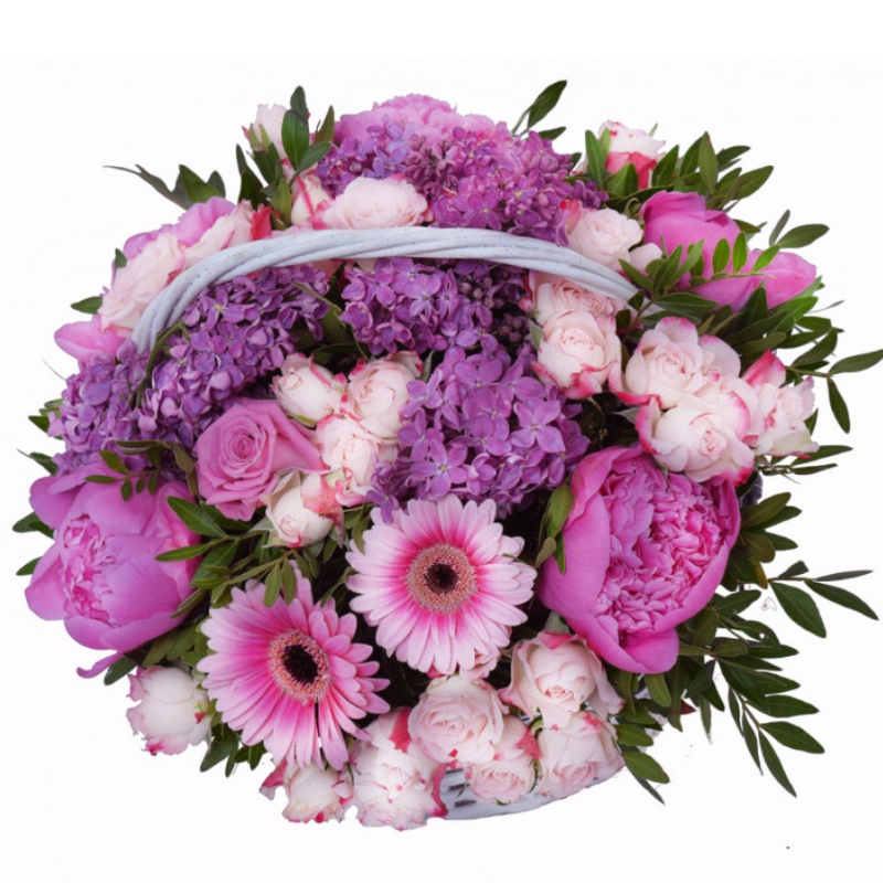 Букет состоит из 5 пионов, 2 герберы, 4 ветки кустовой розы, 1 роза, 1 ветка сирени, зелень, корзина, оазис.