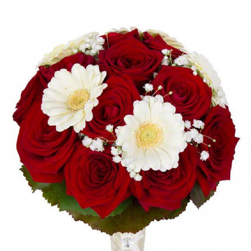 Букет состоит из 12 красных роз, 5 гербер, 1 гипсофила, зелень, атласная лента.